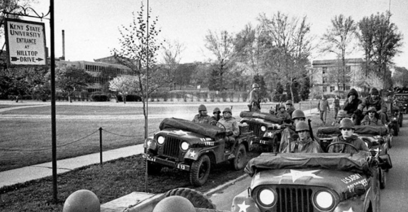 Tin soldiers and Nixon coming, We're finally on our own. This summer I hear the drumming, Four dead in Ohio.